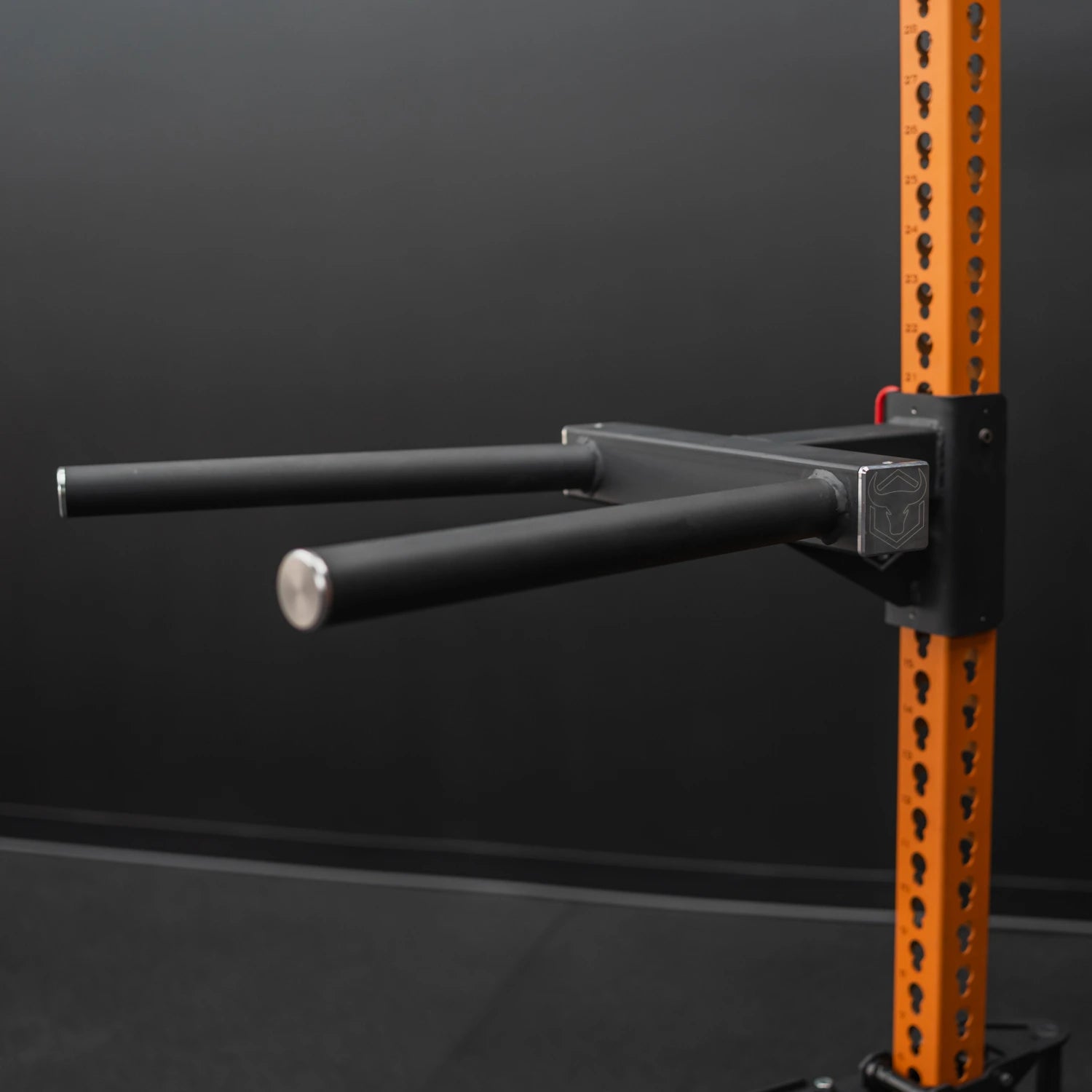 Our dip station is compatible with any of our squat stands and racks, or any 3 x 3-inch rack with 5/8in holes.