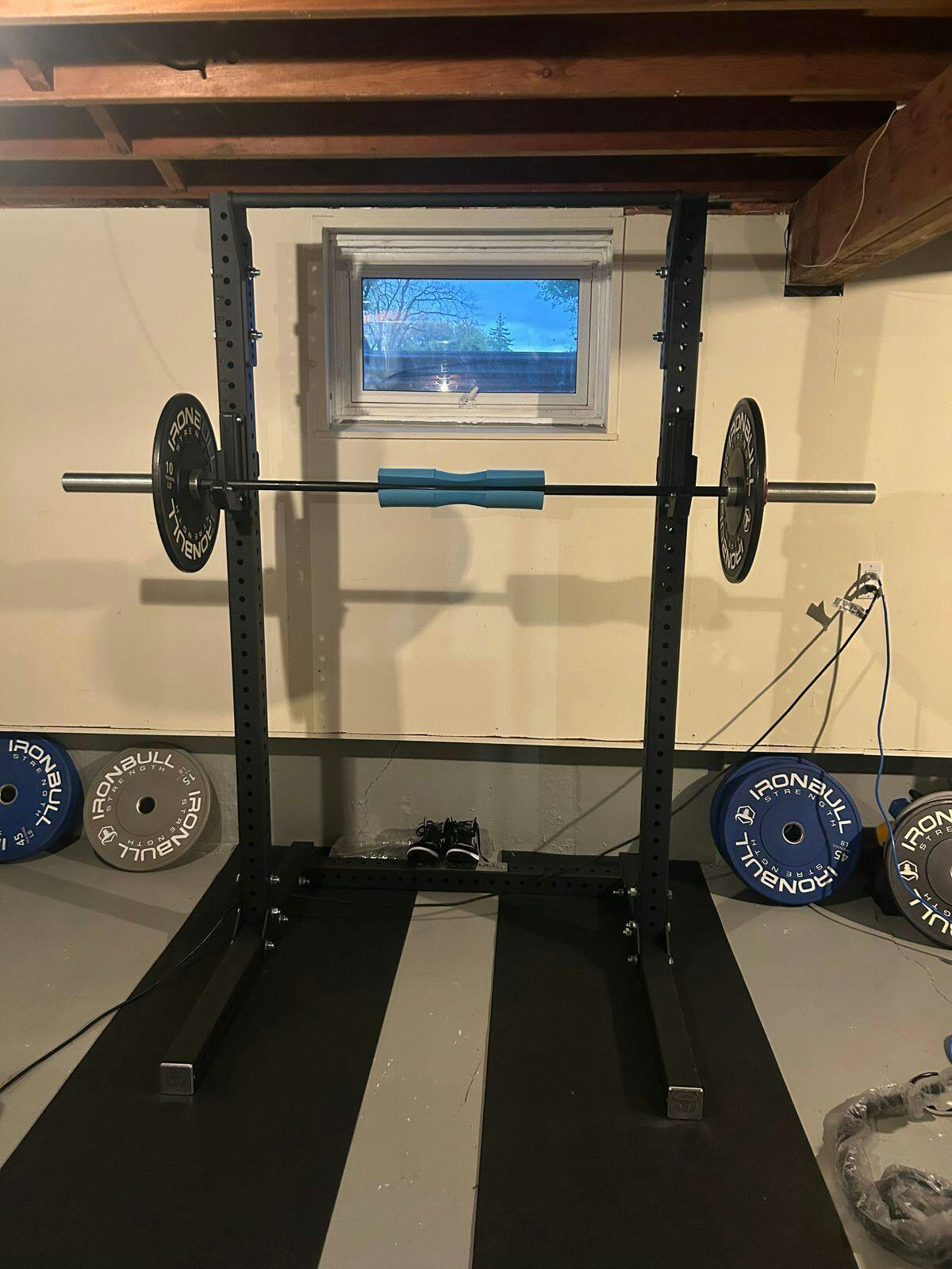 The SR1 comes with competition sandwich J-cups that fit up to 2" bars. These J-cups have a UHMW plate between steel brackets, providing a secure and protective hold for your barbell. The UHMW plastic on the clasp where the J-cup attaches to the rack prevents metal-to-metal contact, ensuring added protection and durability.