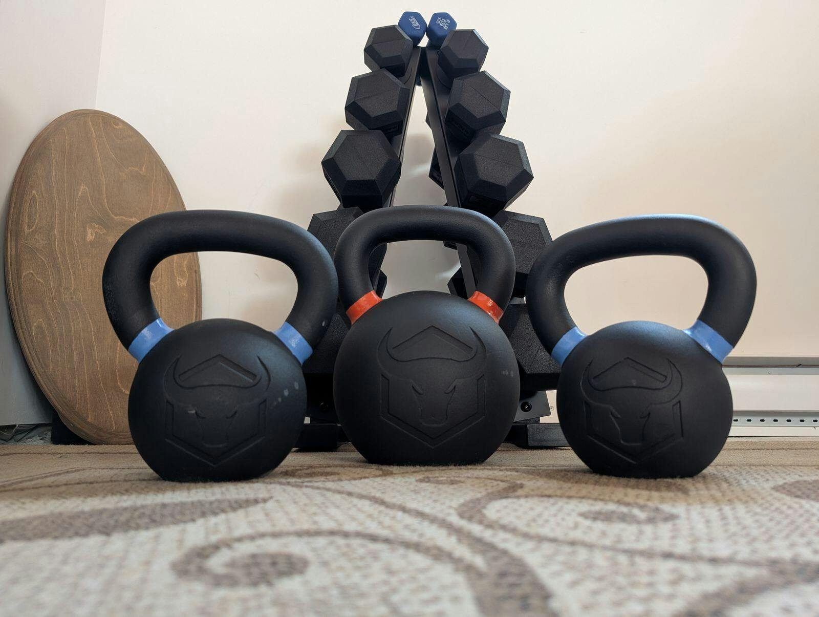 The kettlebells feature color-coded handles associated with each weight increment making it easy to identify the weight of the bell.