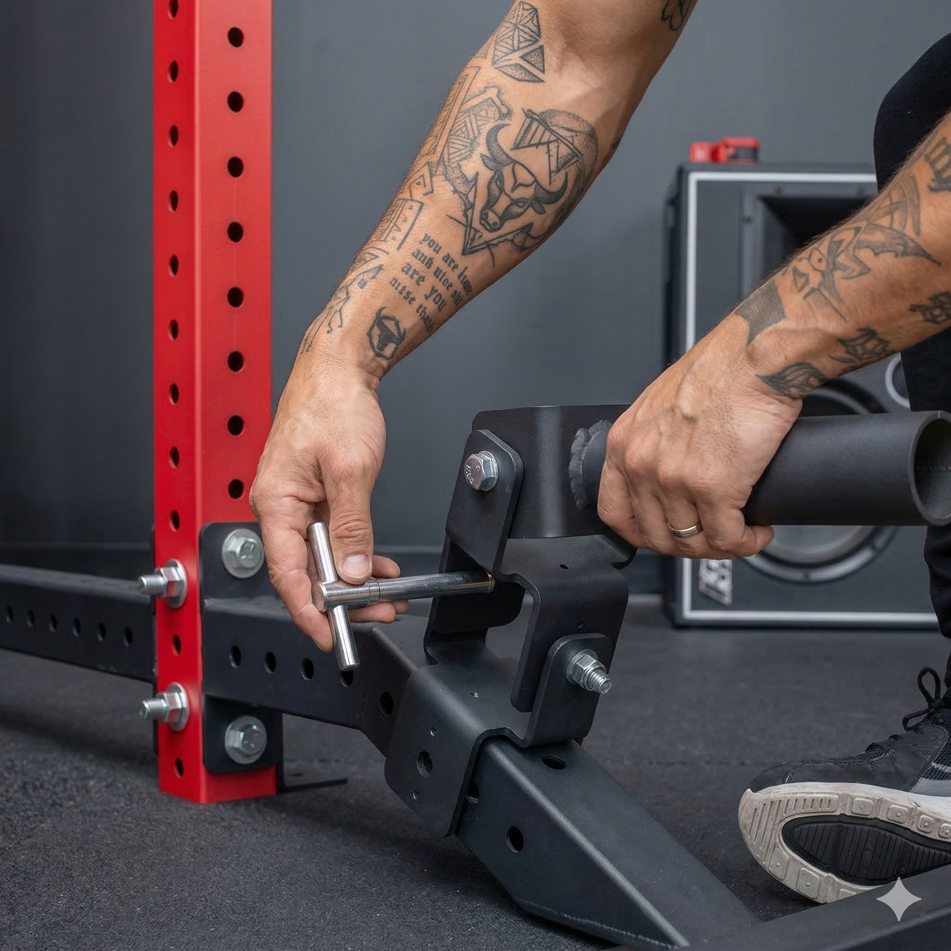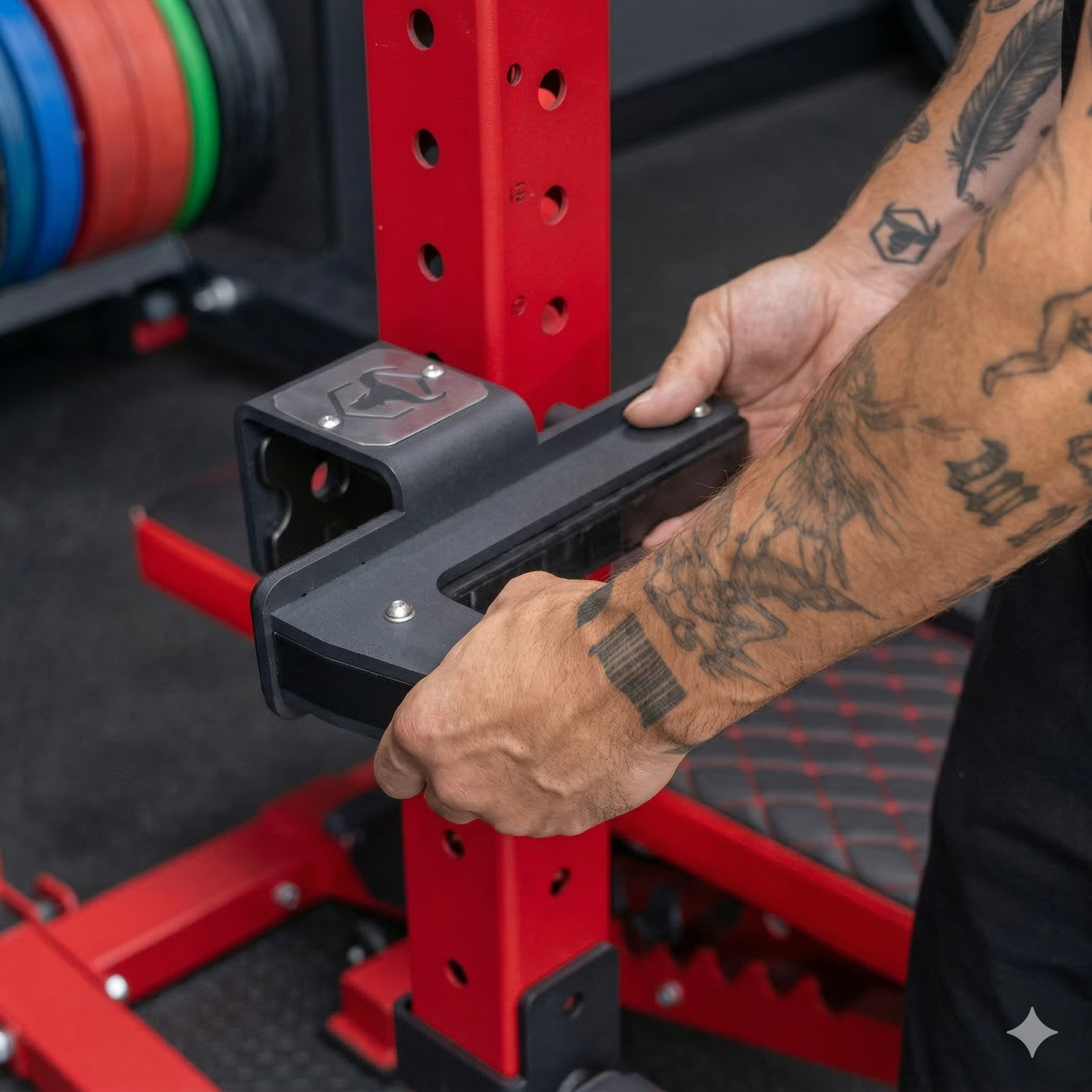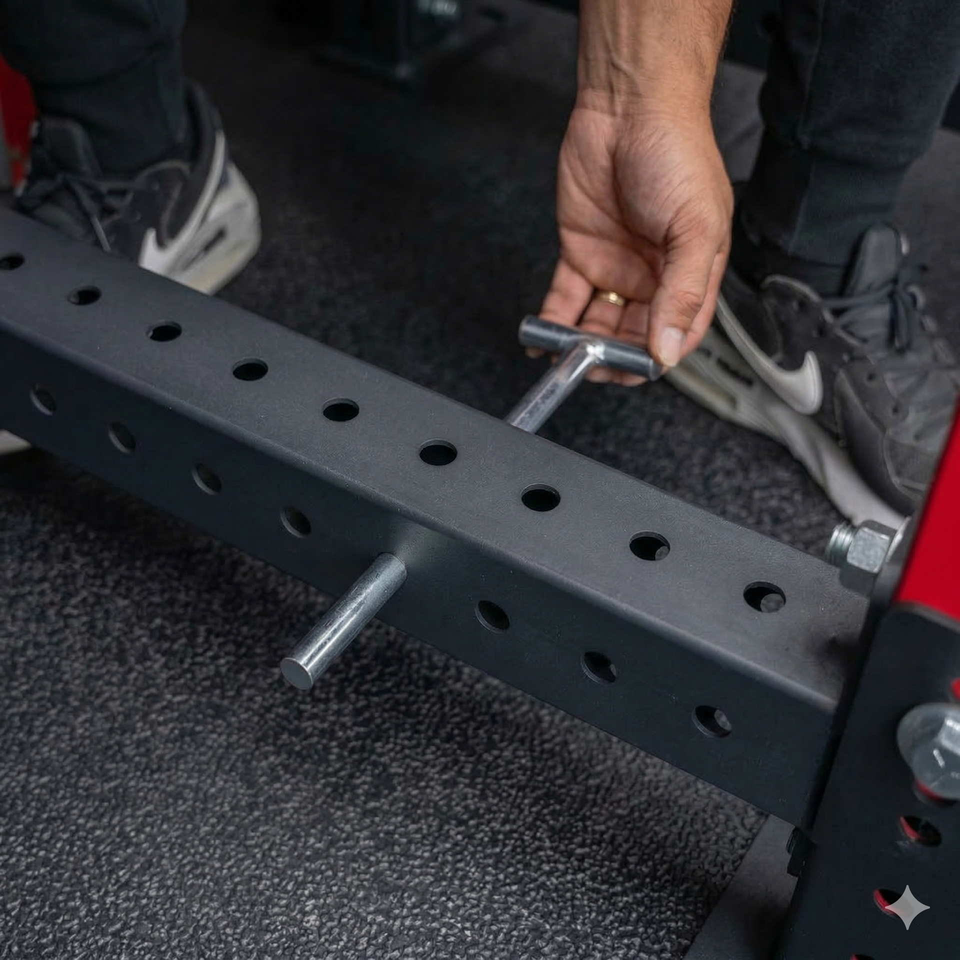 Equipped with durable J-cups designed to securely support your barbell during lifts. Protective lining helps prevent metal-to-metal contact, keeping both the rack and barbell protected while ensuring smooth operation.