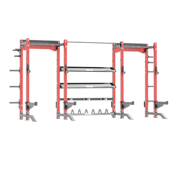 Between the two racks sits a fully customizable storage system designed to keep your space clean and efficient. Choose the setup that fits your training needs or gym equipment. Dumbbells, kettlebells, weight plates, bumper plates, or wall balls, all organized in the central unit. This shared storage keeps everything within reach and gives the whole setup a clean, gym-floor look that feels both functional and premium.